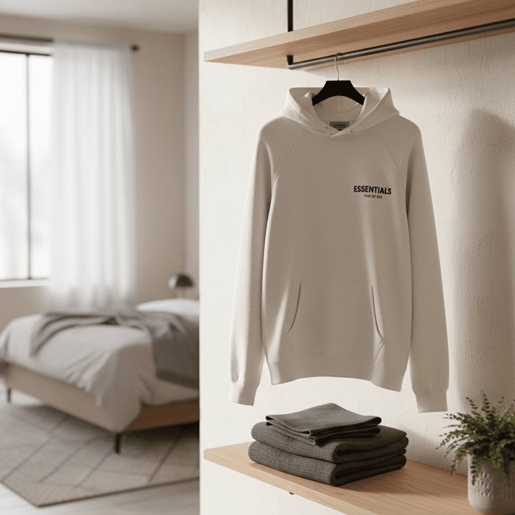 Essentials white hoodie features premium soft breathable cotton, classic hood with kangaroo pocket, bold logo front, unisex streetwear style, warm and stylish for everyday casual wear.