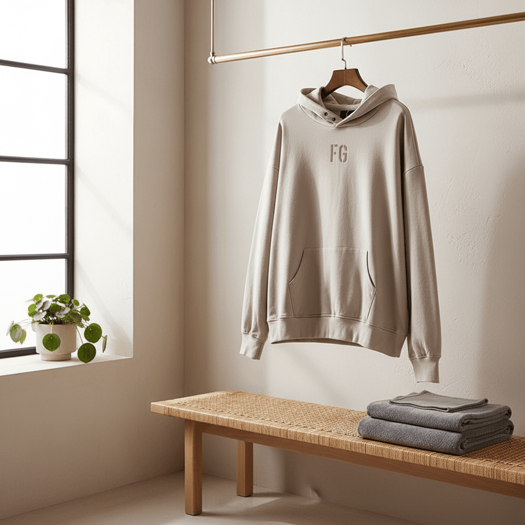 Essentials Hoodie in light khaki features premium soft cotton, breathable design, and iconic FG logo. Unisex streetwear style ideal for everyday casual looks with modern fashion attitude.