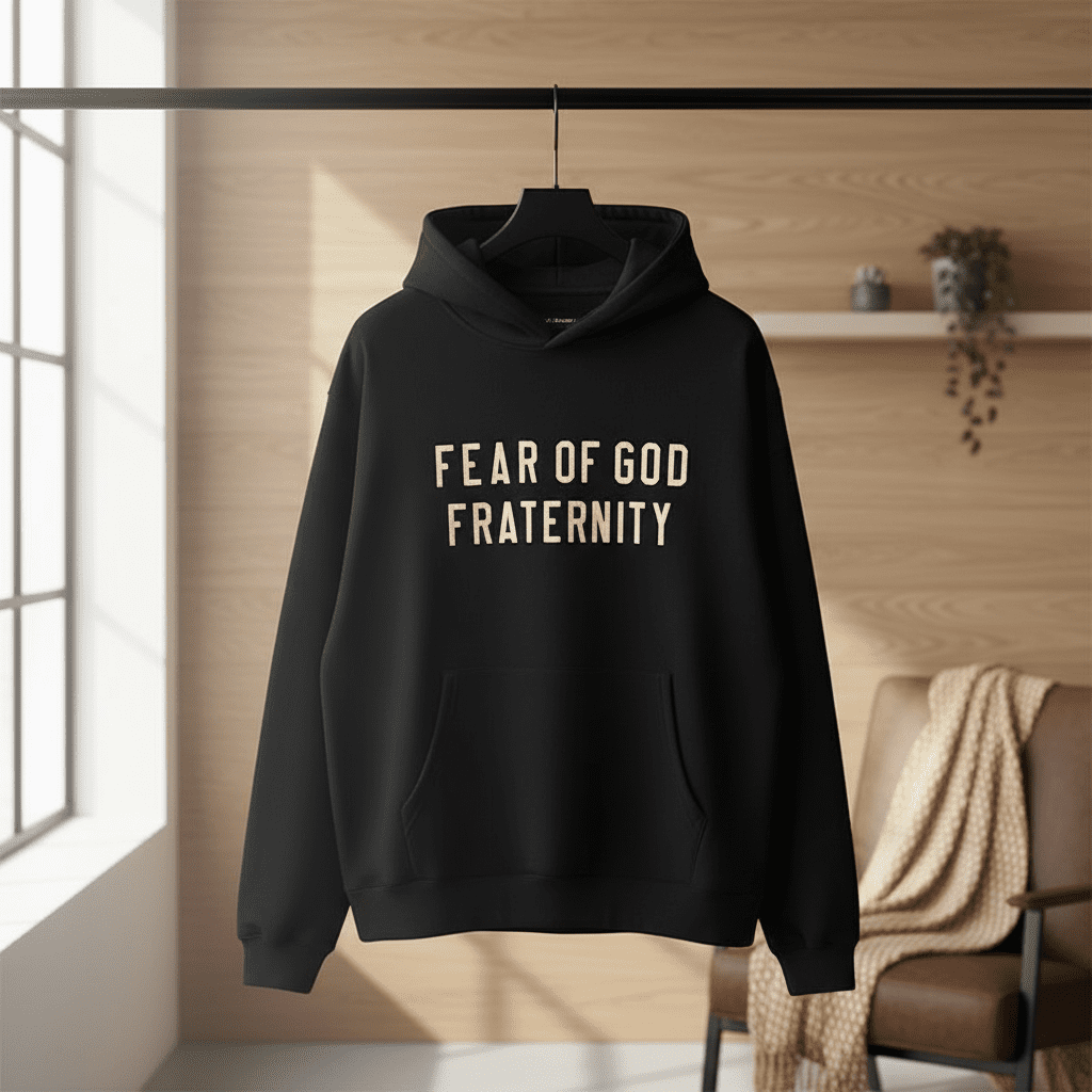 Fear of God Essentials black hoodie made from soft breathable cotton, featuring bold “FRATERNITY” graphic, classic hooded design, unisex streetwear style for everyday comfort and individuality.