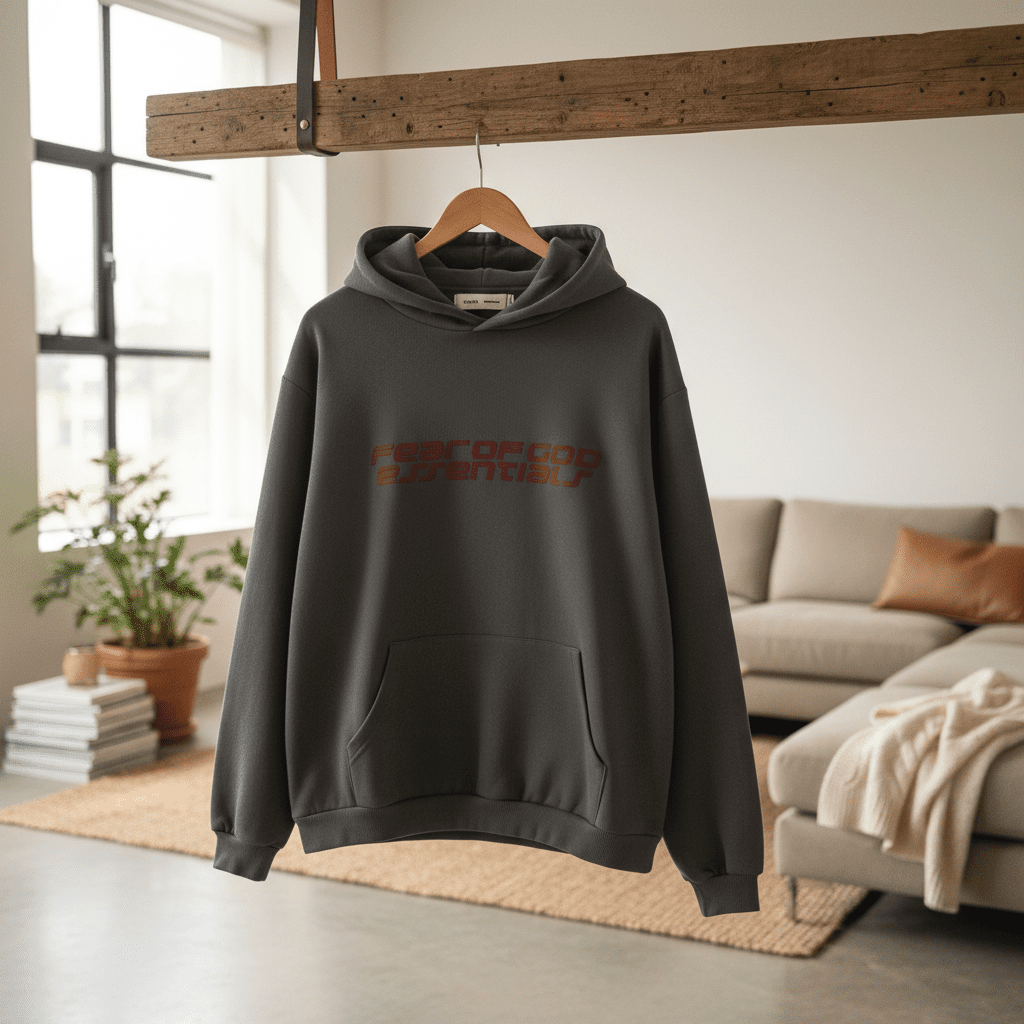 Fear of God Essentials dark gray hoodie made from soft cotton, features red logo print, adjustable drawstring hood, front kangaroo pocket, unisex design for streetwear and casual style.