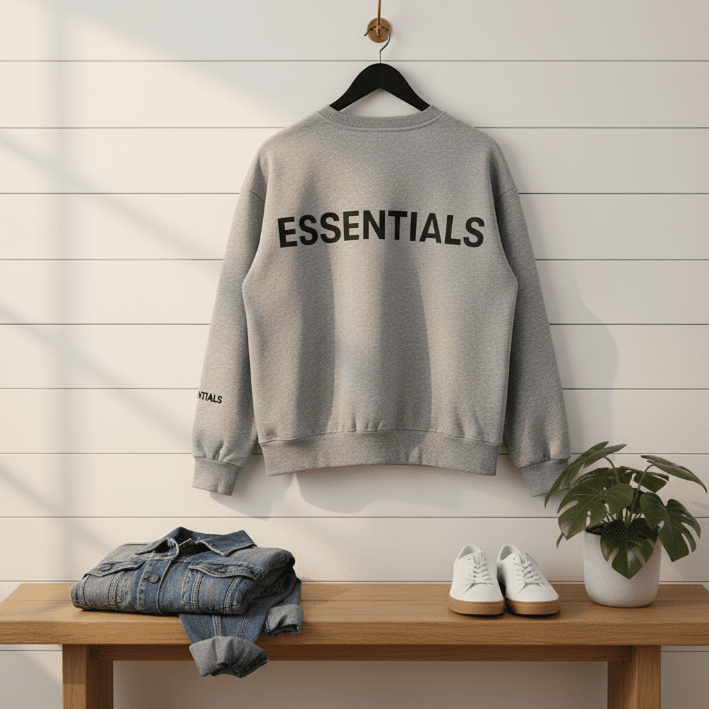 Essentials Basic Collection Grey Crewneck Sweatshirt made of soft cotton fabric, features bold back lettering, refined sleeve logo, relaxed fit for warmth and comfort, unisex streetwear minimalist style.