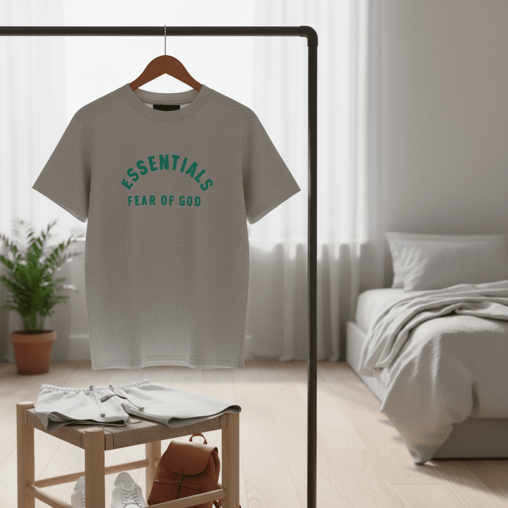 ESSENTIALS Fear of God light gray cotton set, features green logo tee and drawstring shorts, unisex streetwear by Jerry Lorenzo, soft fabric for daily comfort and minimalist style.