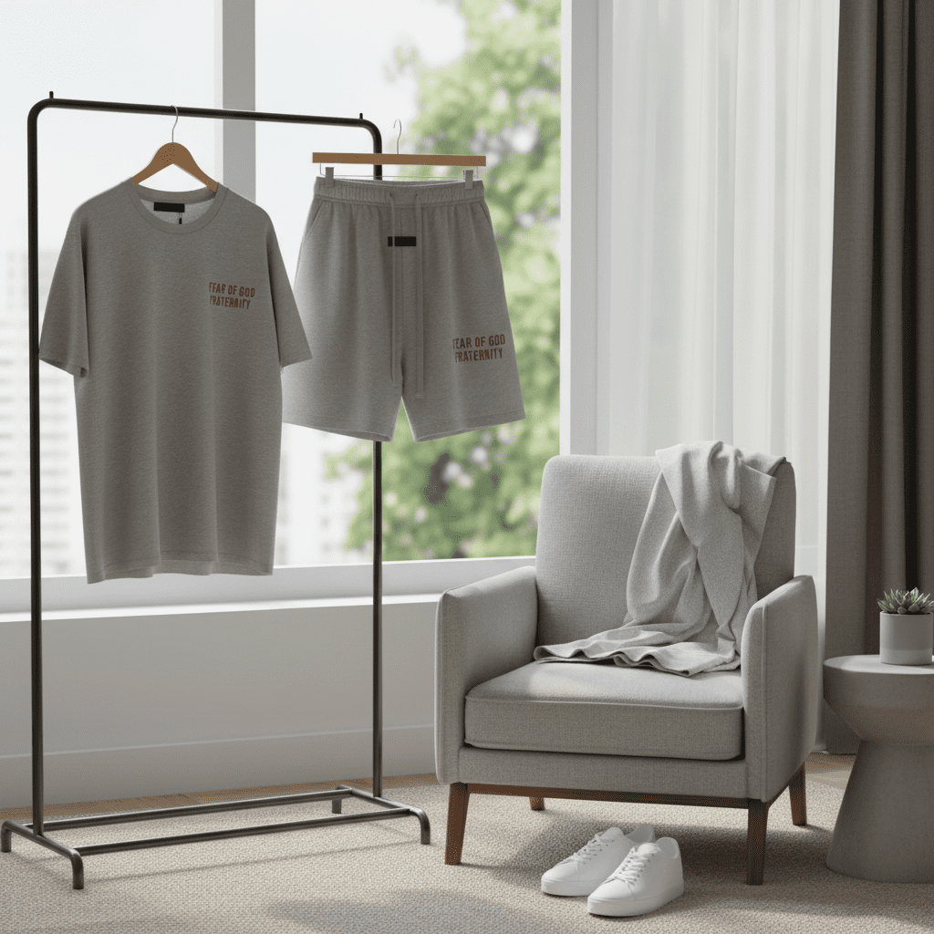 FEAR OF GOD Essentials grey cotton set, loose fit T-shirt and drawstring shorts, red “FEAR OF GOD FRATERNITY” print, unisex streetwear style, comfy casual outfit for daily wear.