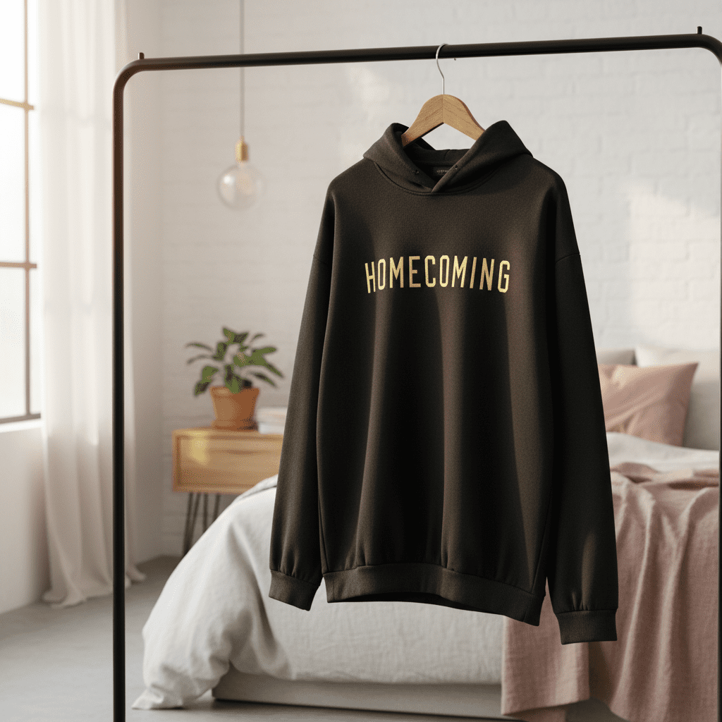 Essentials Black Hoodie features soft cotton fabric, bold gold “HOMECOMING” print, classic drawstring hood, unisex streetwear design, warm, comfy and stylish for everyday casual wear.
