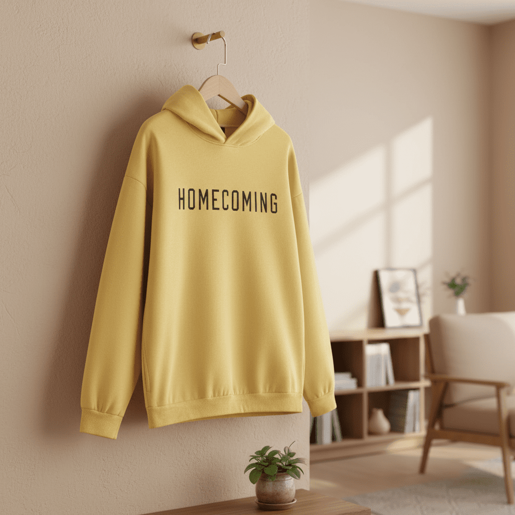 Essentials Yellow Hoodie – Premium cotton, HOMECOMING print front, cozy hooded design, minimalist street style for men and women, perfect for everyday casual wear.