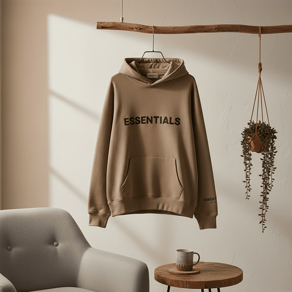 Essentials Khaki Hoodie made from soft cotton fabric, cozy and warm. Features signature logo prints on chest and sleeve. Unisex streetwear with hood and kangaroo pocket for daily casual style.