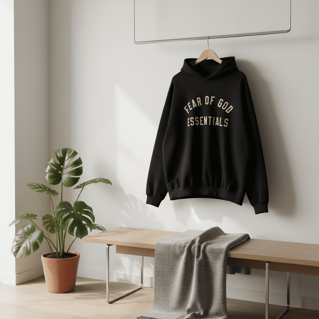 Fear of God Essentials black hoodie made from soft breathable cotton, featuring bold logo lettering, unisex design, streetwear style for everyday comfort and effortless fashion attitude.