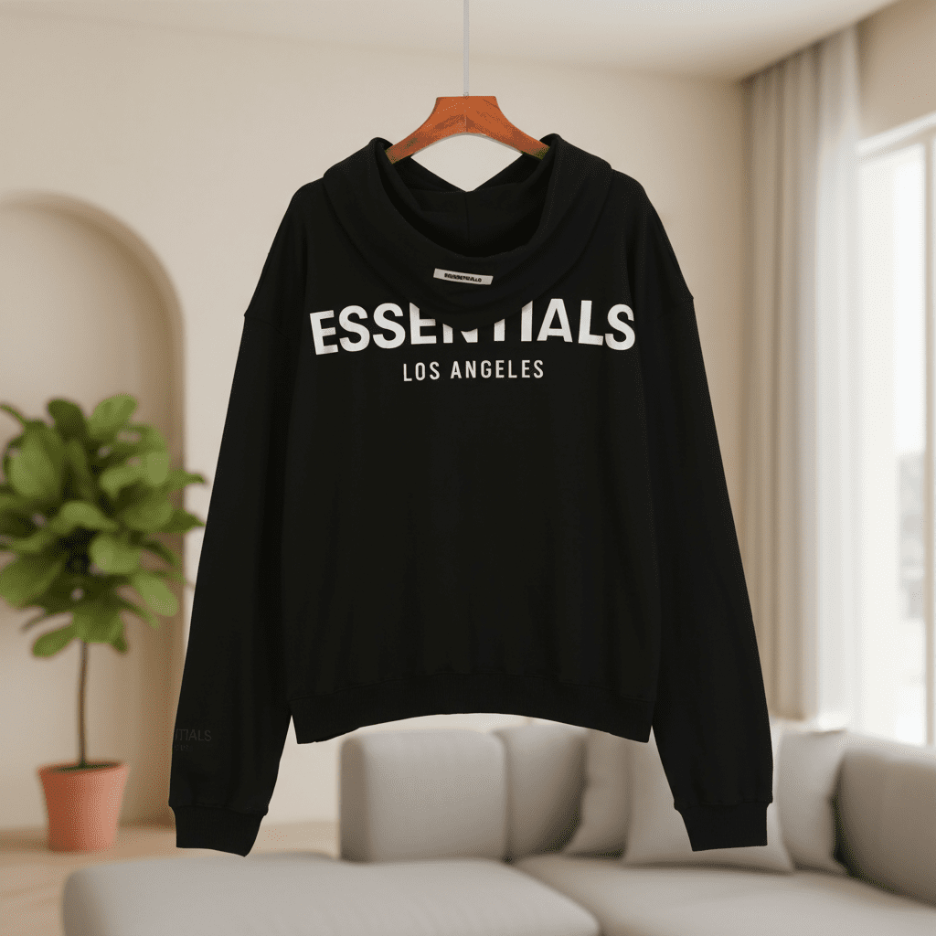 Essentials Los Angeles Hoodie – premium cotton, soft and comfortable, classic black design with white logo, unisex streetwear style perfect for casual everyday outfits.