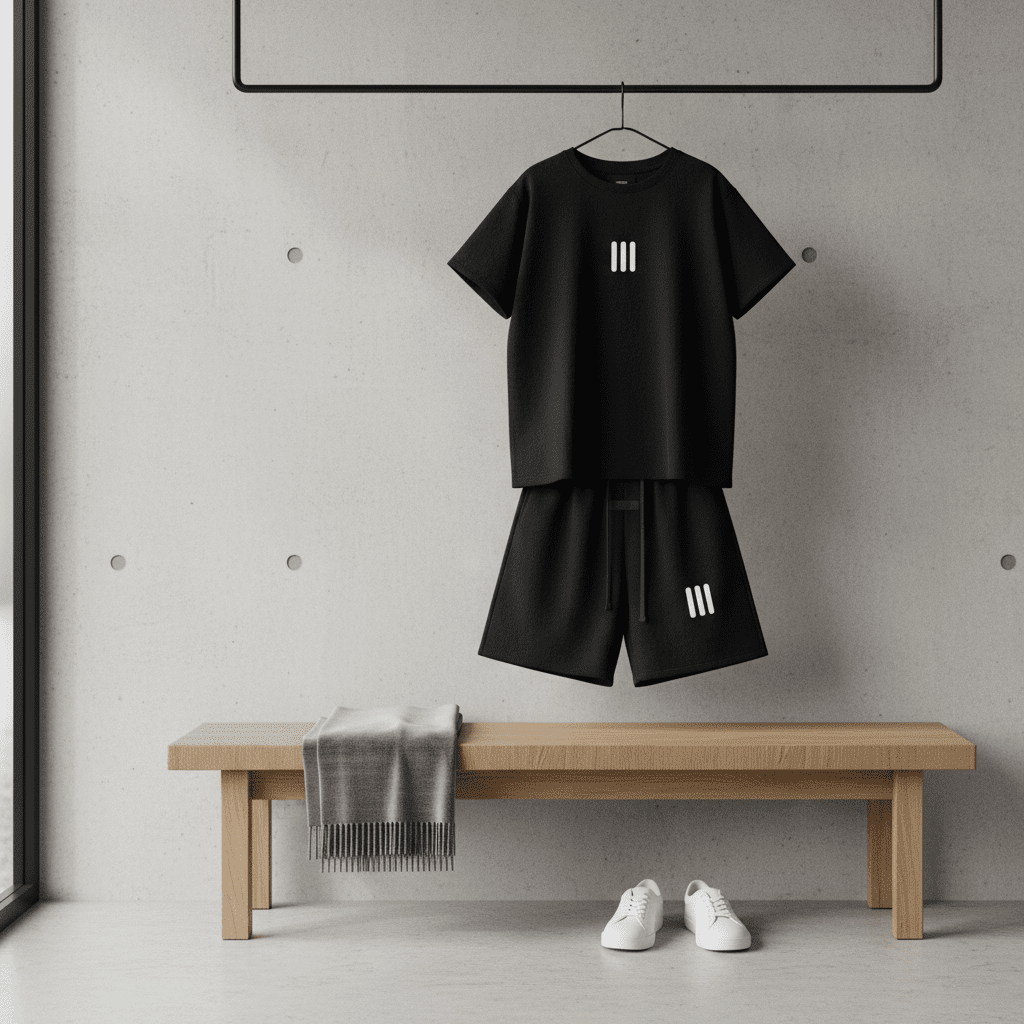 Essentials Black Cotton T-Shirt and Shorts Set, featuring white vertical stripe design, unisex casual outfit, modern street style, soft premium fabric, perfect for daily comfortable wear.