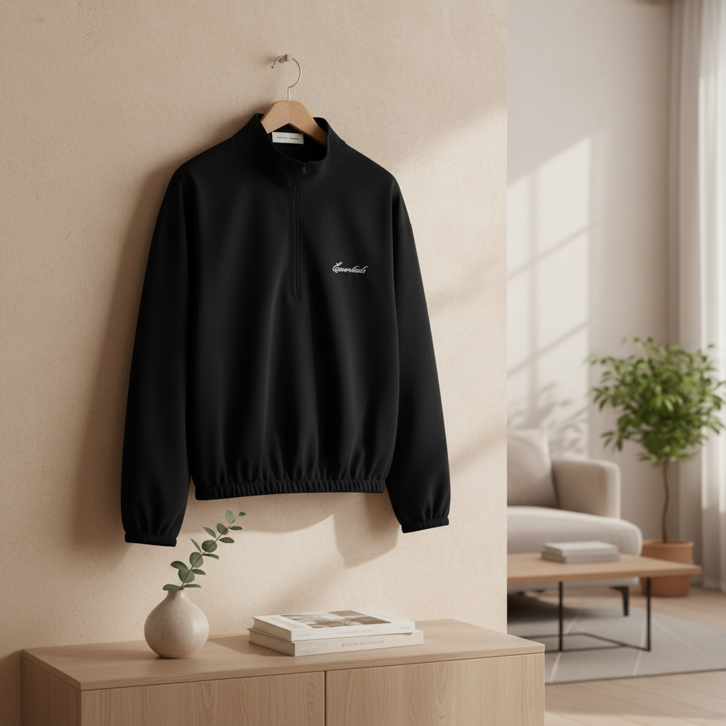 Essentials Black Half-Zip Stand Collar Pullover crafted from soft, breathable fabric with embroidered logo on chest; unisex streetwear style, easy on and off, perfect for daily casual outfits.