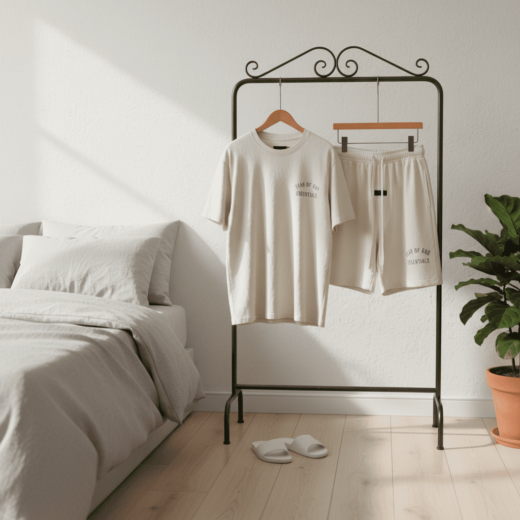 Fear of God Essentials off-white cotton casual set, breathable and soft, unisex loose fit with logo print, minimalist street style perfect for daily wear and modern fashion looks.