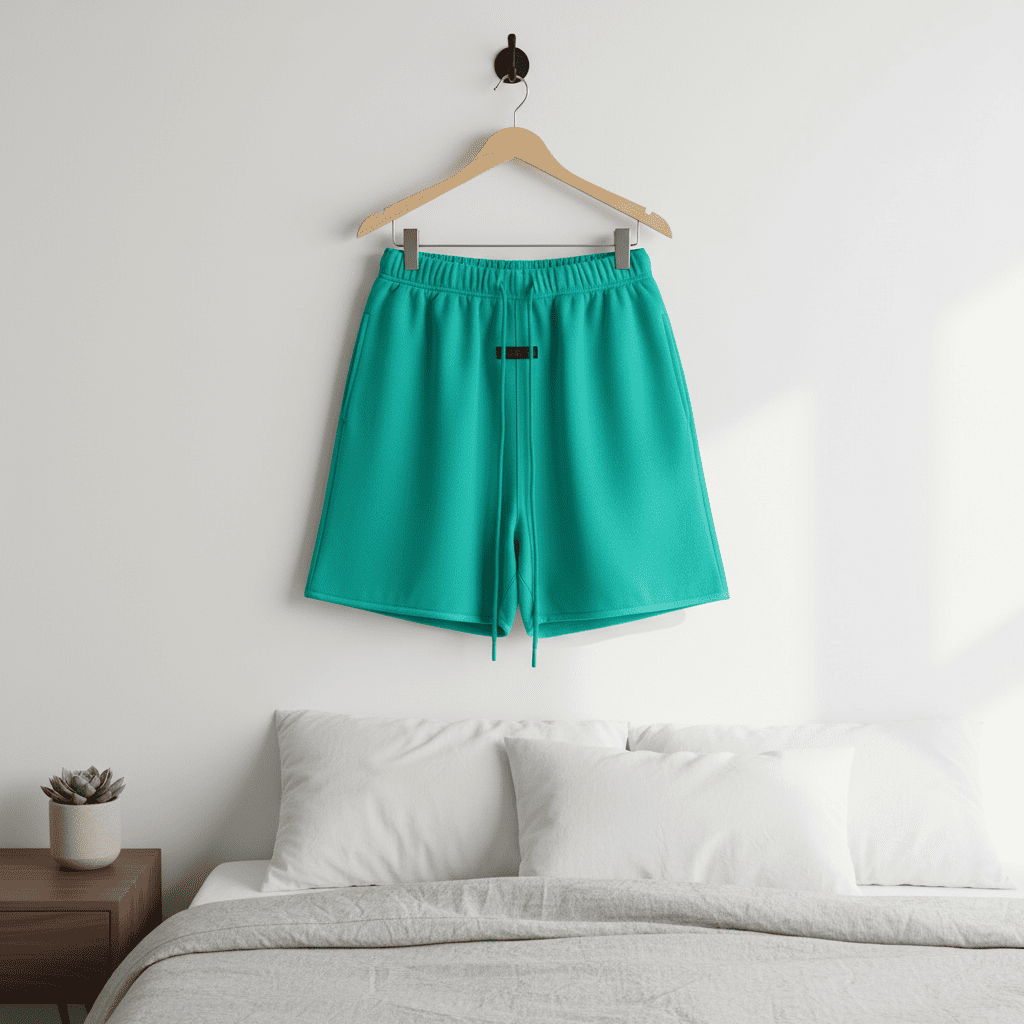 Essentials Mint Green Cotton Shorts feature a soft fabric, elastic waistband with drawstring, unisex design, and minimalist street style—perfect for everyday casual wear.