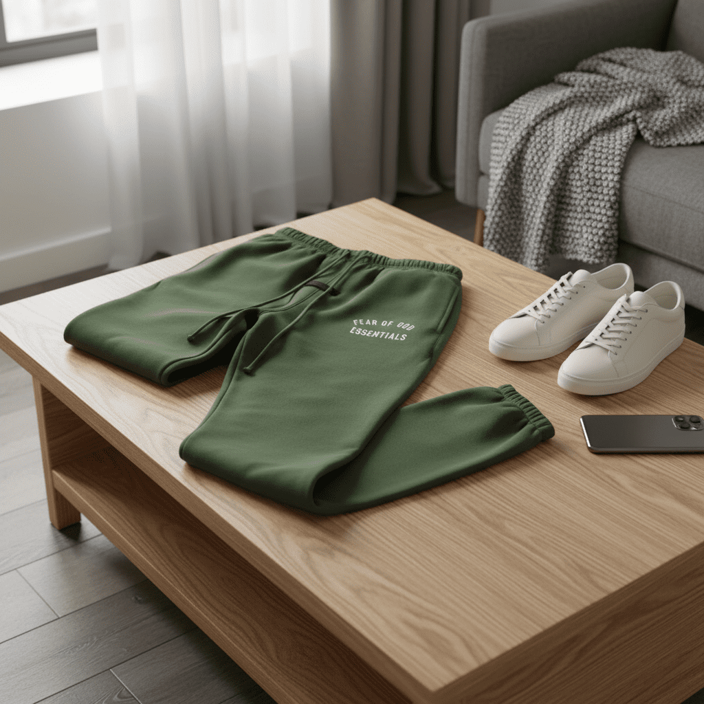 Fear of God Essentials olive green jogger pants made from premium breathable cotton, featuring adjustable drawstring waist, side pockets, brand logo print, unisex streetwear style perfect for daily casual wear.