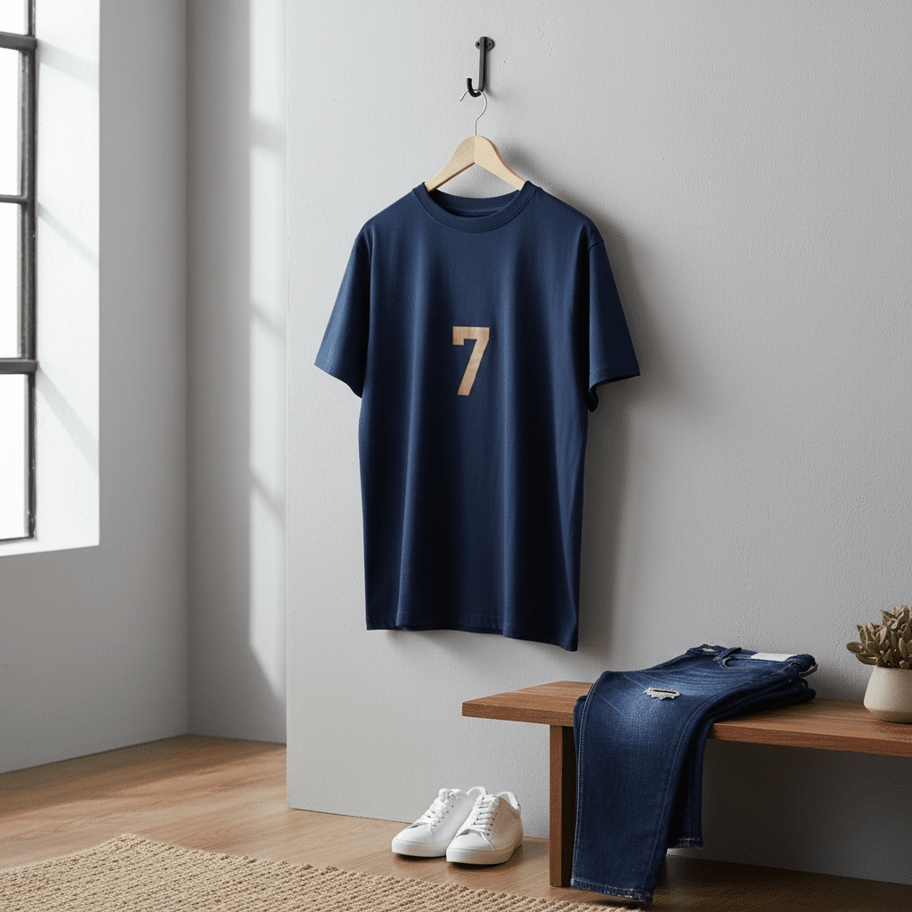 Essentials Navy Blue Number 7 Graphic T-Shirt made from premium cotton, soft and breathable. Unisex streetwear style featuring a bold gold 7 on the back, perfect for daily casual outfits.