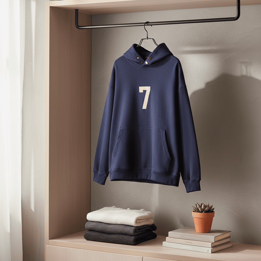 Essentials Navy Blue Hoodie, soft breathable cotton, metal snap hood, white number 7 print, unisex design, kangaroo pocket, casual stylish comfort for everyday wear.