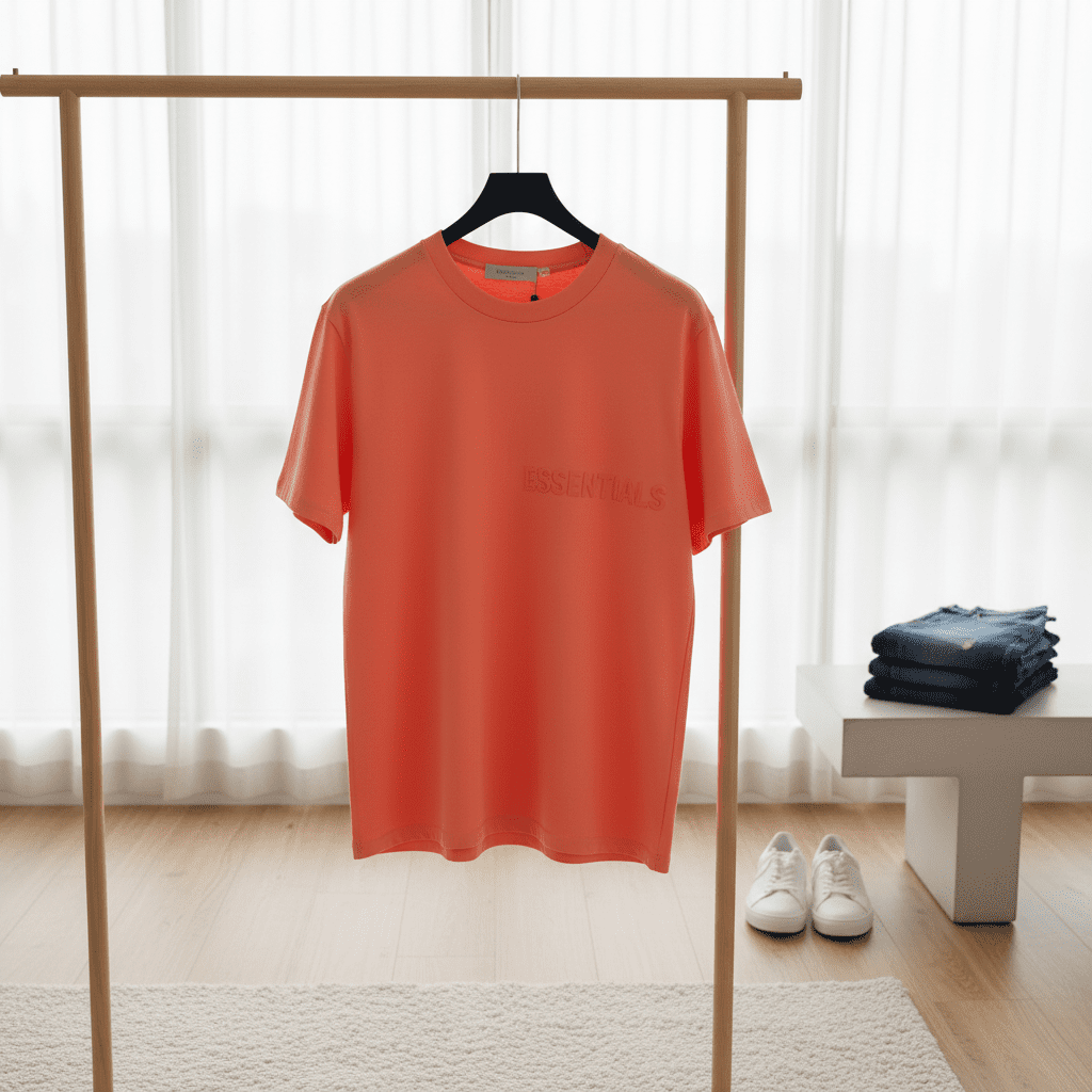 Essentials Classic Orange T-Shirt, made from premium cotton, features a chest logo print, unisex streetwear style, lightweight, breathable, and perfect for everyday casual wear.