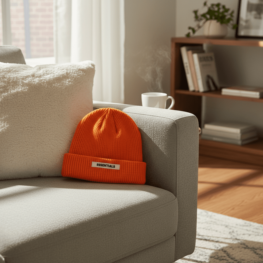 Essentials Orange Knit Beanie – made from soft breathable fabric, keeps you warm and stylish. Features signature logo patch, unisex streetwear design perfect for everyday urban outfits.