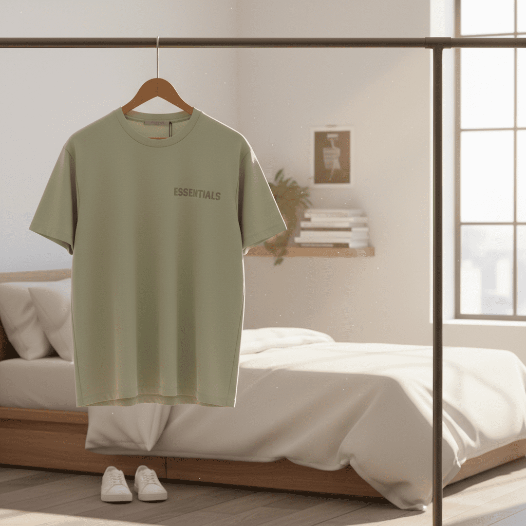 Essentials Light Khaki T-Shirt, soft breathable cotton, relaxed fit with crew neck and tonal logo print; minimalist streetwear style, unisex design for modern casual daily wear.