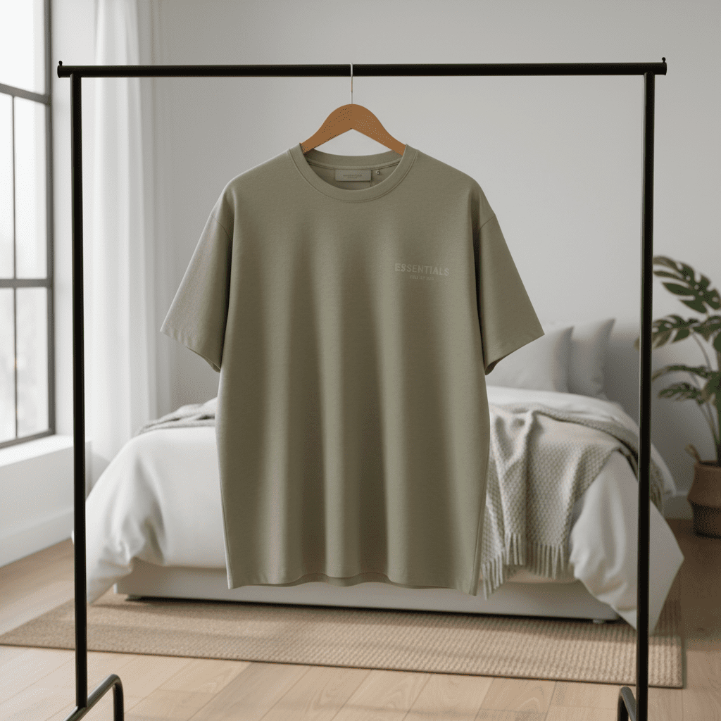 Essentials Khaki Loose Fit T-Shirt, made from soft breathable cotton with front logo print, unisex design, perfect for casual street style and everyday wear with effortless fashion vibes.