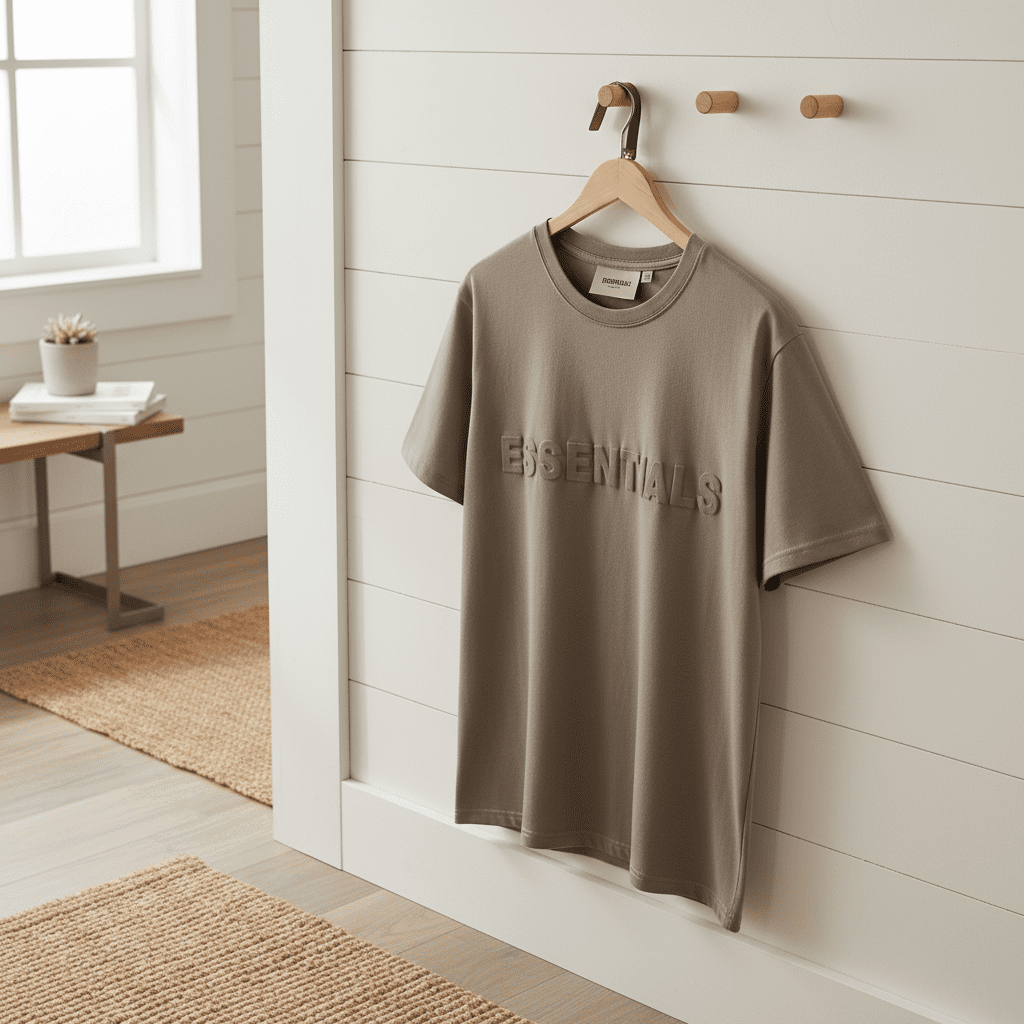Essentials Light Gray Cotton T-Shirt with 3D Embossed Logo, Unisex Casual Streetwear Style, Soft Breathable Fabric for Everyday Comfort and Modern Minimalist Look.