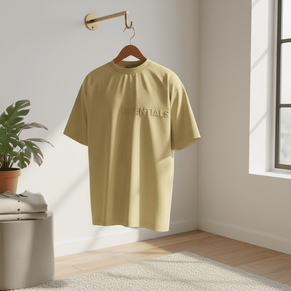 Essentials Beige Cotton T-Shirt, crafted from premium fabric with a relaxed fit, breathable and stylish. Features embossed logo design, unisex streetwear look, perfect for casual everyday wear.