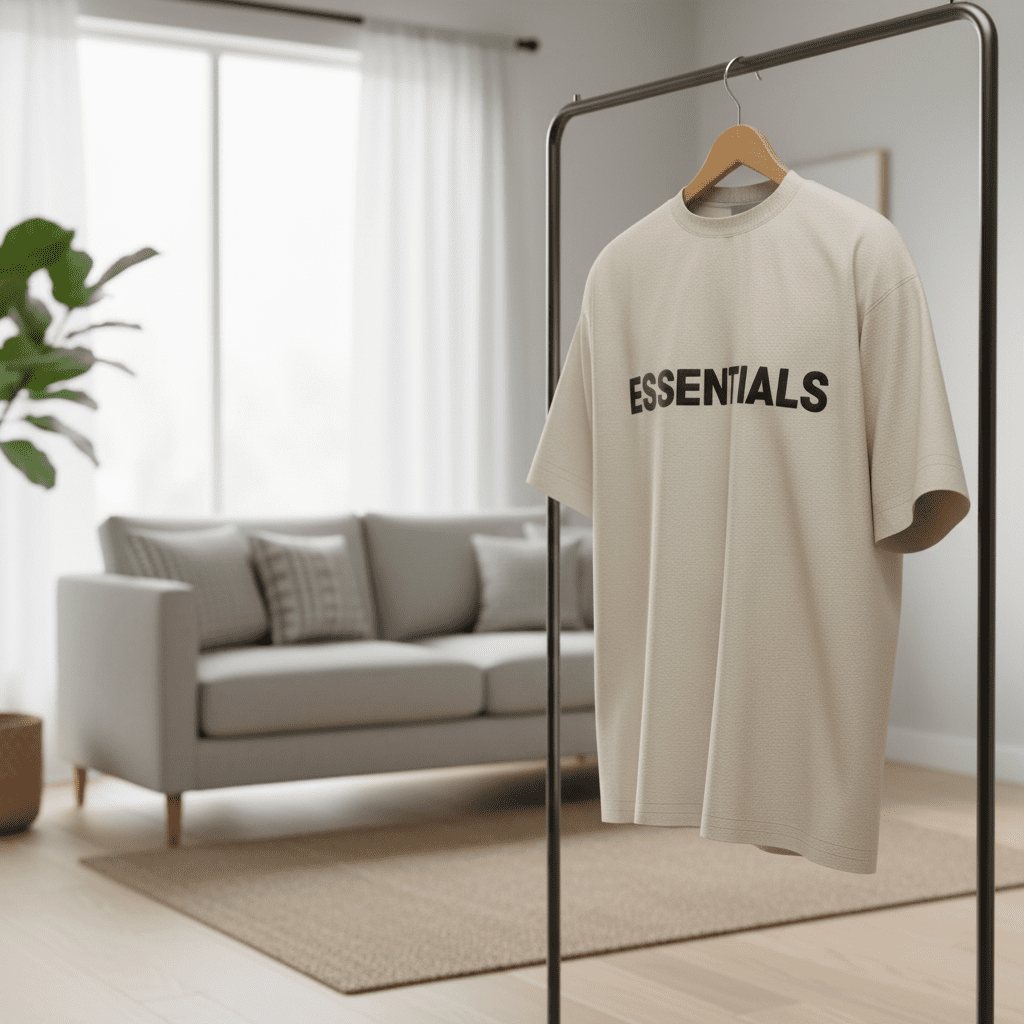 Essentials Beige Oversized T-Shirt, crafted from premium cotton for breathable comfort. Features bold black logo print for a minimalist streetwear look, perfect for everyday unisex casual style.