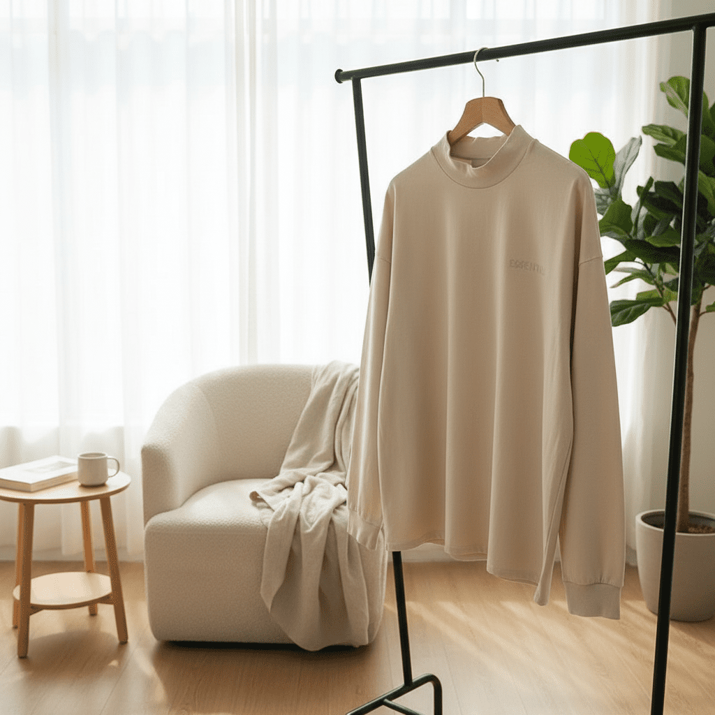 Essentials Beige High Neck Long Sleeve T-Shirt, cotton fabric, relaxed fit, unisex design, minimalist casual style, subtle chest logo, breathable comfort, perfect for daily versatile wear.