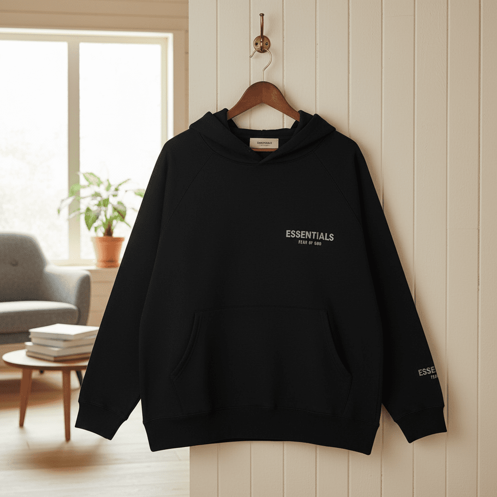 Essentials Classic Black Hoodie made from premium cotton for comfort and warmth. Features hood and kangaroo pocket, front brand logo, unisex design, perfect for daily casual street style.