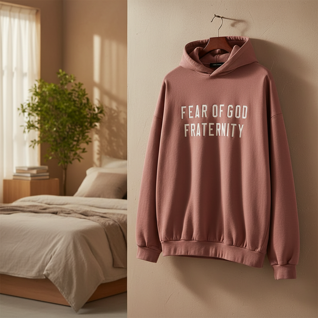 Fear of God Essentials Fraternity Hoodie—soft cotton fabric, dusty pink color, bold white lettering, unisex oversized fit, streetwear style, cozy and warm for everyday casual wear.