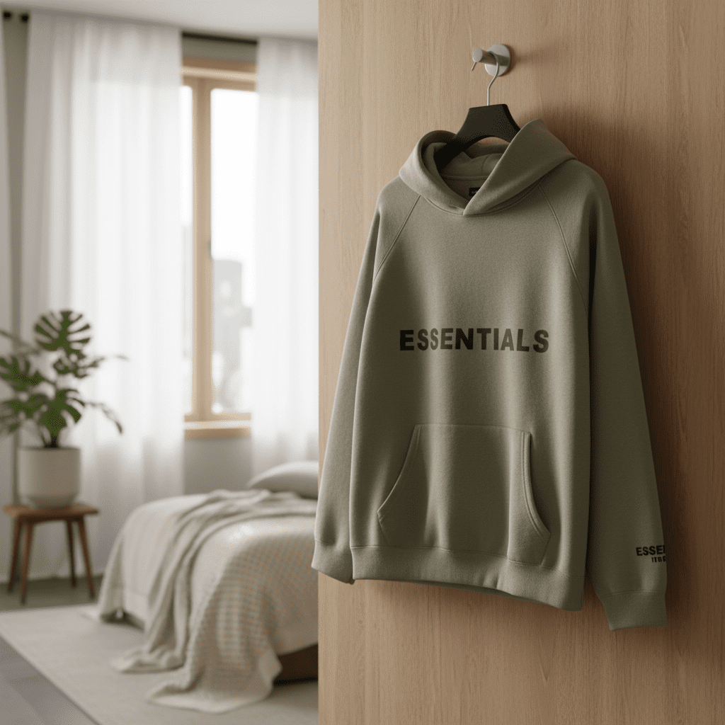 ESSENTIALS Khaki Hoodie made from premium cotton, soft and breathable. Features bold logo print, classic hood, and kangaroo pocket. Unisex streetwear style, perfect for daily casual fashion.