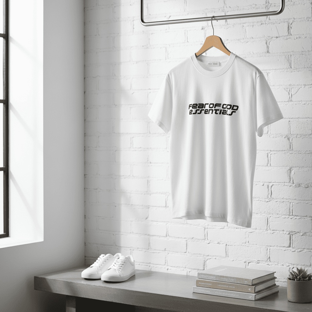 Fear of God Essentials White T-Shirt, made of soft breathable cotton with black logo print, offers a minimalist street style for men and women, perfect for daily casual wear and effortless fashion.