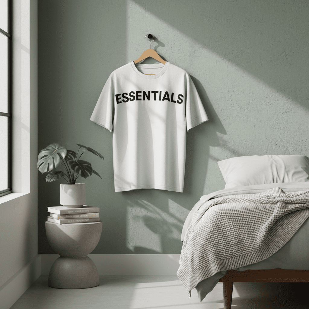 Essentials White Oversized T-Shirt, made from premium soft cotton, featuring bold black “ESSENTIALS” logo on the back, unisex streetwear style for daily comfort and trendy casual looks.