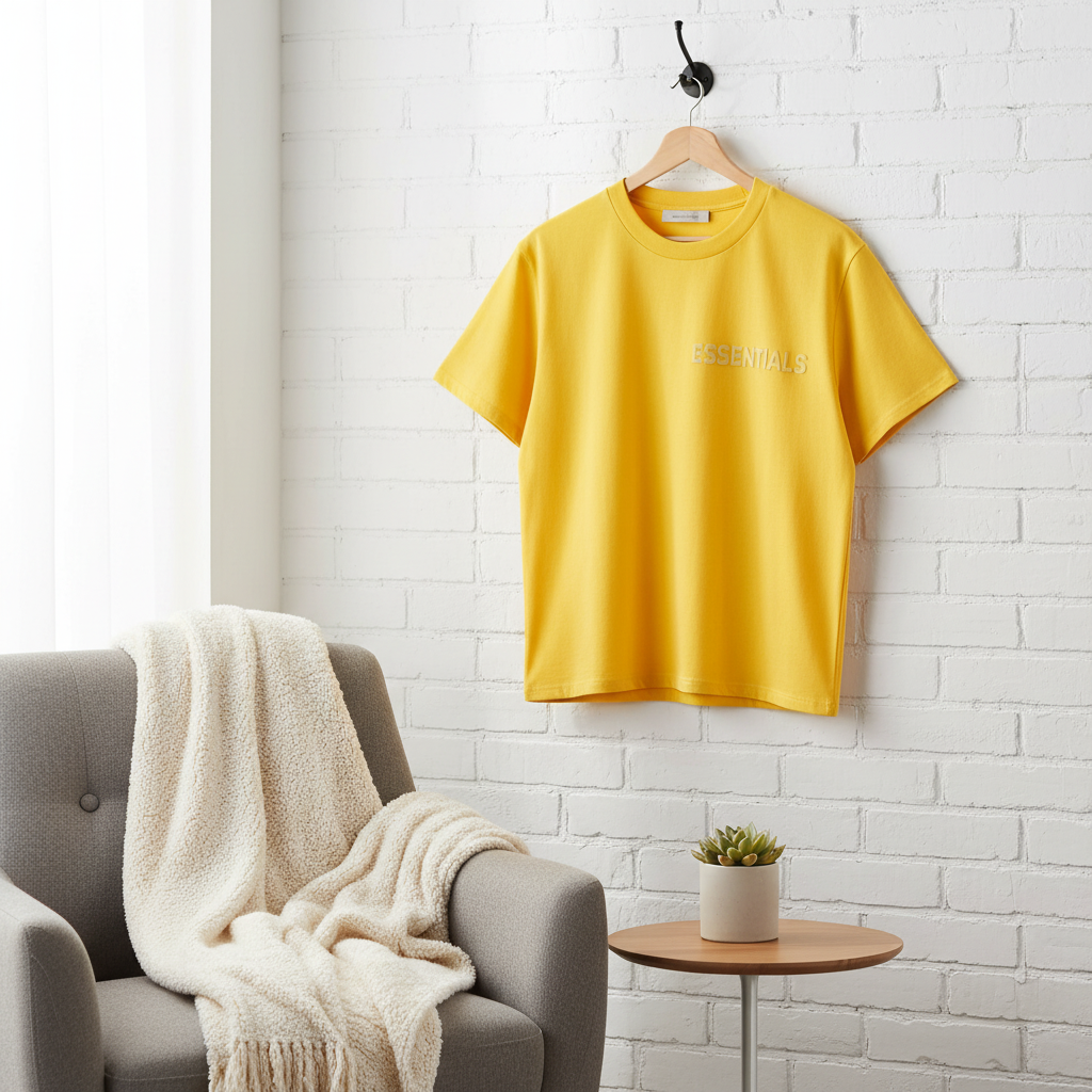 ESSENTIALS Yellow Cotton T-Shirt, breathable and soft fabric with classic crew neck and front logo print, unisex streetwear design for casual daily style, trendy and versatile fashion look.