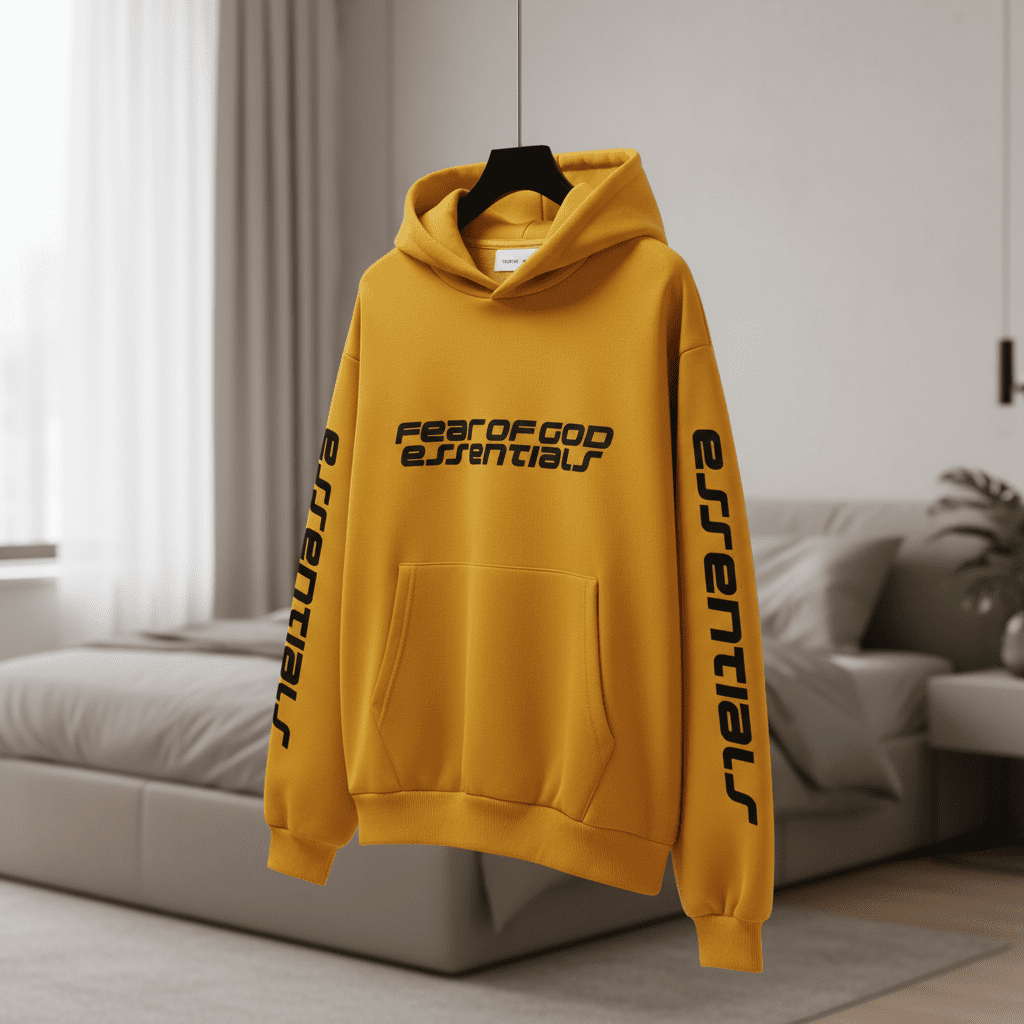 Fear of God Essentials Ginger Yellow Hoodie, soft cotton fabric with logo prints on chest and sleeves, classic drawstring hood, kangaroo pocket, unisex streetwear style, cozy and trendy daily wear.
