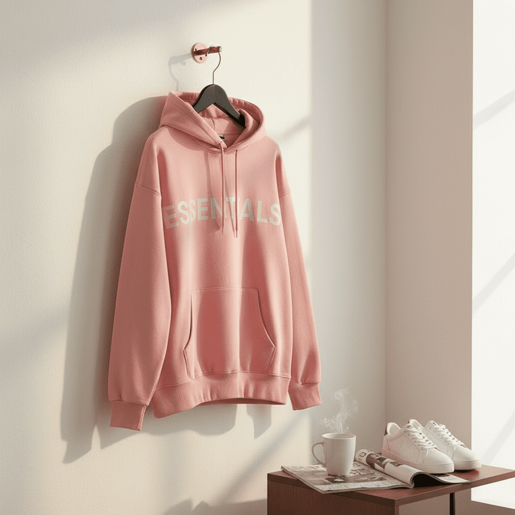 Essentials Pink Hoodie from the Essentials Collection, made of premium soft cotton, featuring a hood, ribbed cuffs, and bold white “ESSENTIALS” print on the back. Unisex streetwear for daily casual style.