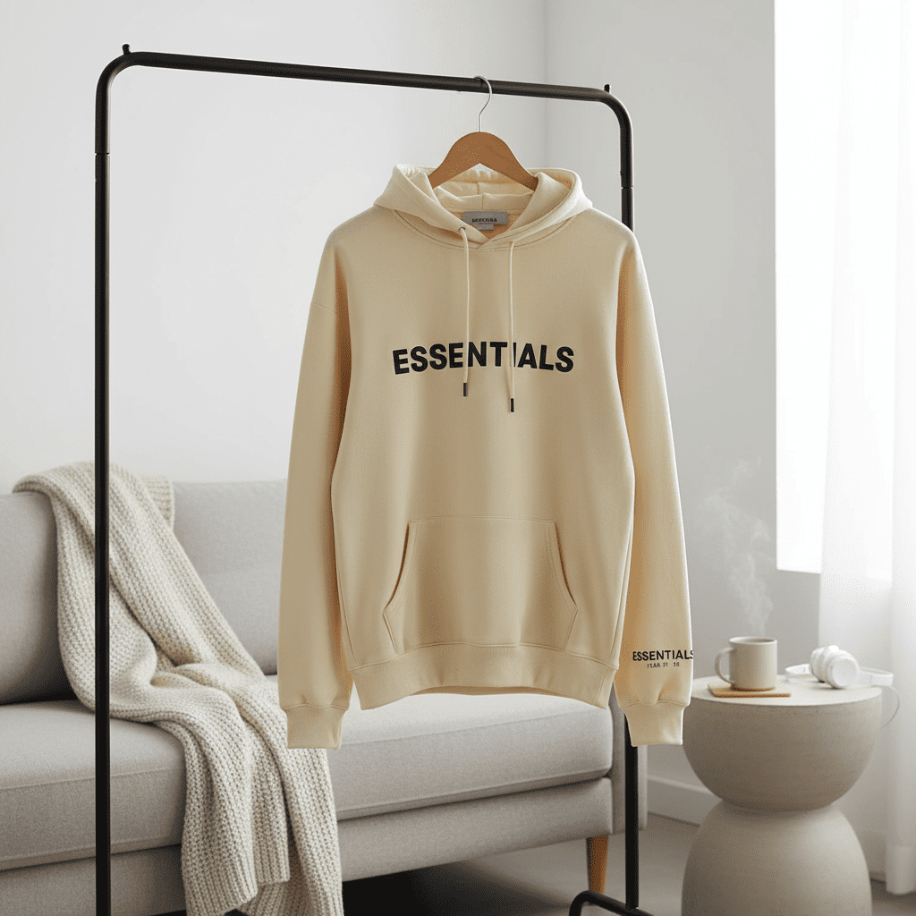 ESSENTIALS Off-White Hoodie, made from premium cotton, soft and breathable. Features hood, kangaroo pocket, logo prints on chest and cuff. Unisex casual style for comfy everyday wear.