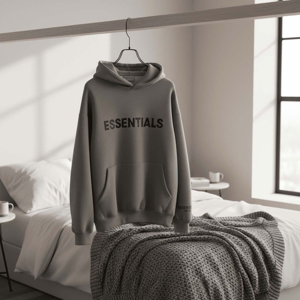 Essentials Grey Hoodie – Premium cotton fabric for comfort and warmth. Features bold ESSENTIALS logo, branded hood and cuffs. Unisex streetwear style perfect for everyday casual outfits.