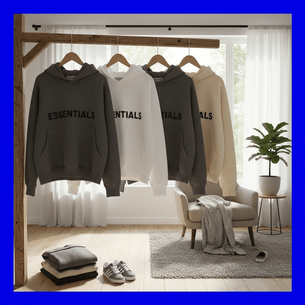 Essentials Grey Hoodie—made from premium soft, breathable cotton with the iconic “ESSENTIALS” logo on chest, hooded design with small collar tag, unisex street style for daily casual comfort.