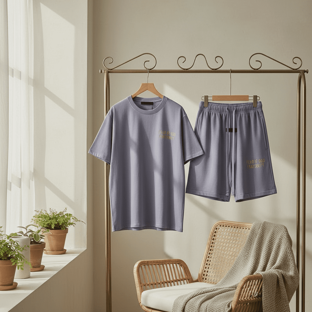 Fear of God Essentials light purple cotton set with “FEAR OF GOD FRATERNITY” gold logo, soft breathable fabric, unisex street style, perfect for daily casual wear and effortless fashion.