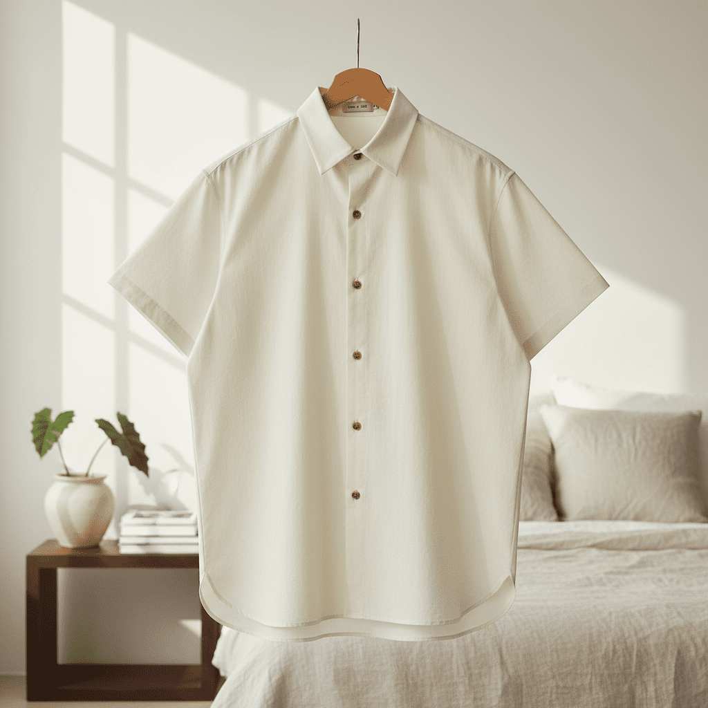 Essentials White Oversized Short Sleeve Shirt, made with breathable soft fabric, classic collar and button-down design, curved hem, unisex fit for daily casual comfort and versatile style.