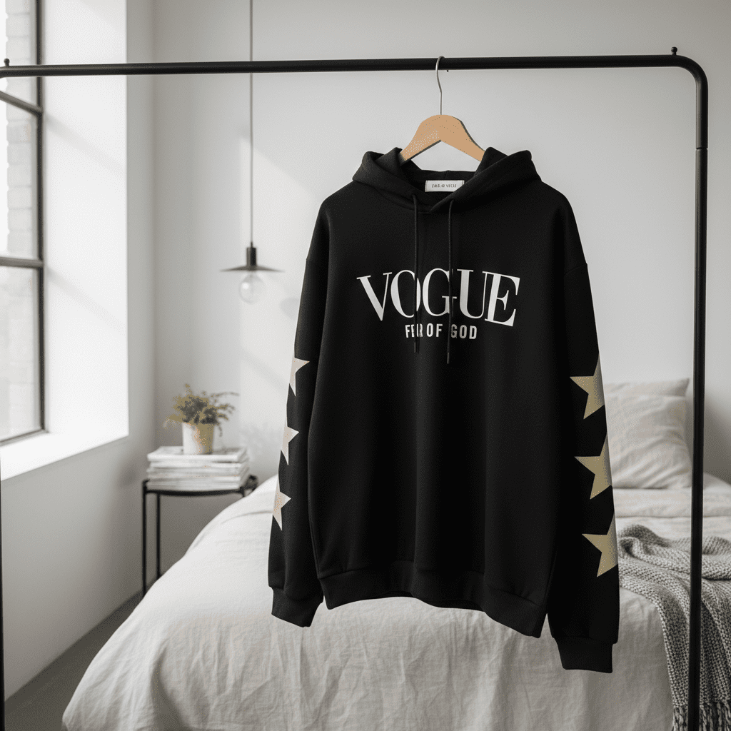Fear of God Essentials x Vogue Black Hoodie, soft cotton fabric, star sleeve print, oversized street style, unisex design for everyday casual wear.