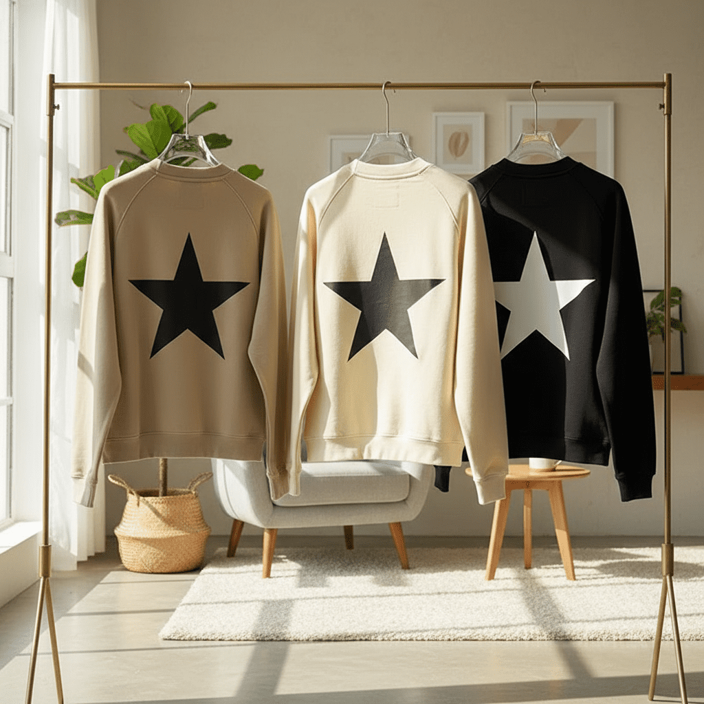 HoodiesEssentials Cream Crewneck Sweatshirt features soft breathable cotton, bold back star graphic, streetwear-inspired unisex design for everyday comfort and style.
