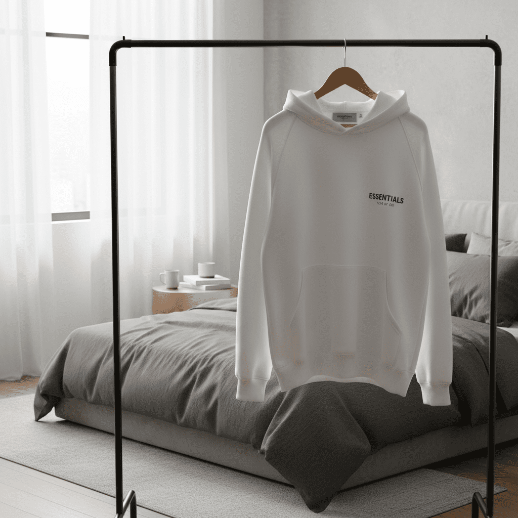 ESSENTIALS white cotton hoodie, soft and breathable fabric, logo print on chest and cuff, unisex streetwear style, ideal for daily casual wear, warm, stylish, and comfortable.