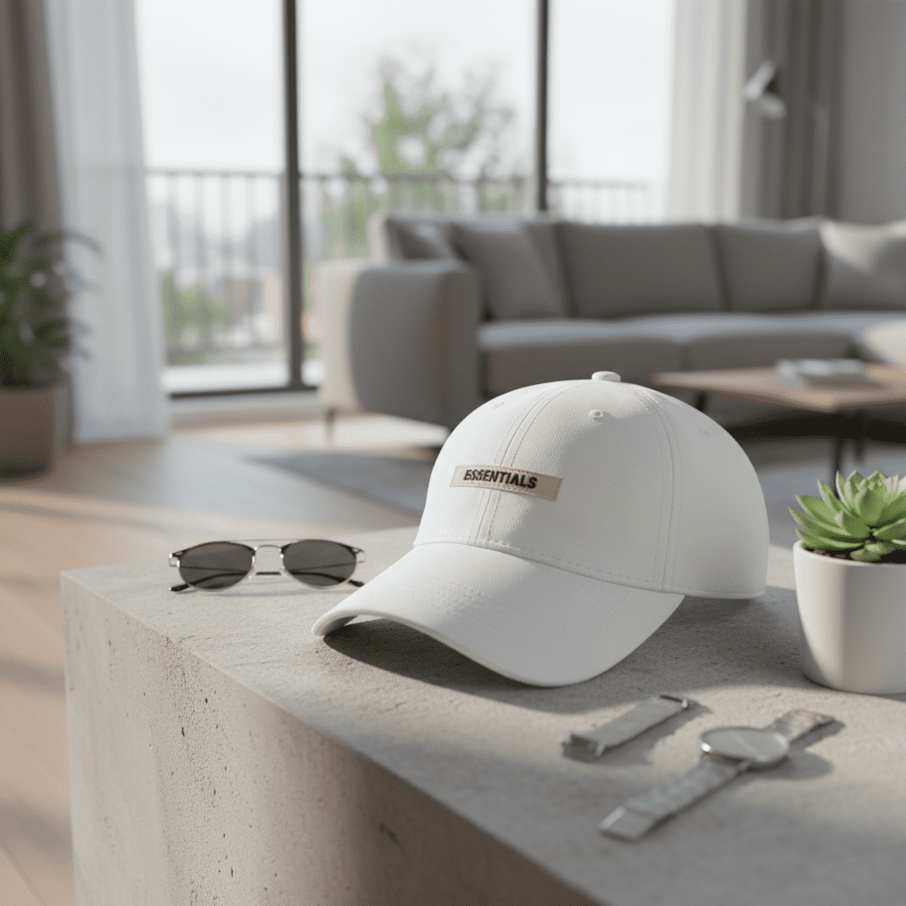 Essentials White Cotton Baseball Cap, breathable and comfortable, featuring front brand label, unisex design, stylish streetwear look, perfect for daily outfits and sun protection.