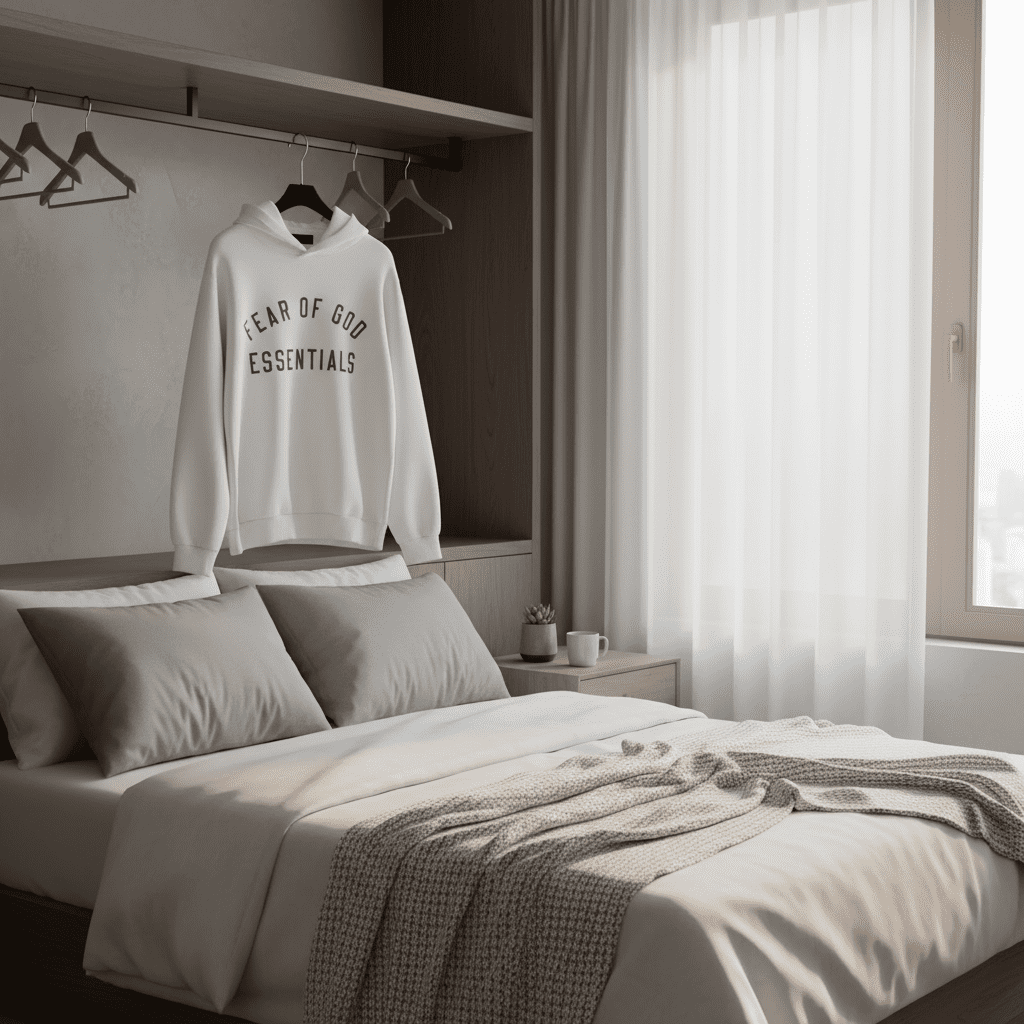 Fear of God Essentials white hoodie set, made from premium cotton for soft comfort, features logo print, drawstring hood, jogger pants design, unisex streetwear for daily casual style.