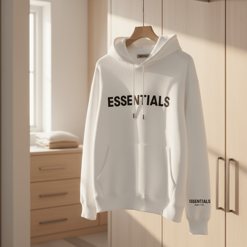 ESSENTIALS white hoodie by Jerry Lorenzo, made from soft breathable cotton, features bold front logo, hood with brand tag, sleeve detail, unisex street style for everyday casual wear.