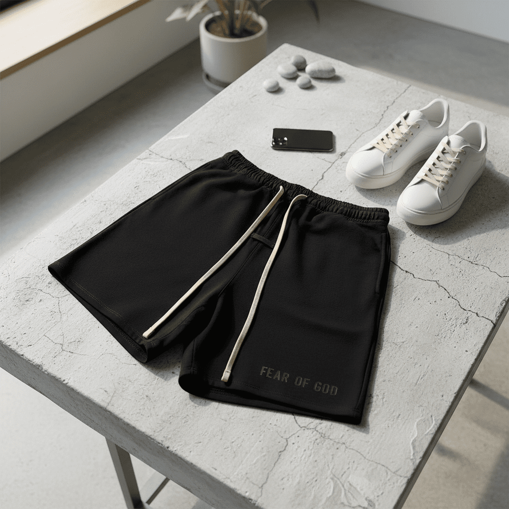 Fear of God Essentials black cotton shorts feature soft fabric, side logo print, beige drawstring design, unisex fit, street style look, perfect for daily casual wear.