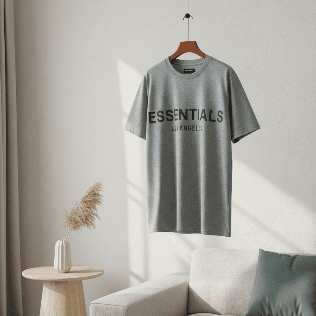 Fear of God Essentials Grey T-Shirt, made from premium cotton for soft comfort and breathability. Features black “ESSENTIALS LOS ANGELES” print on back. Unisex streetwear for everyday casual style.
