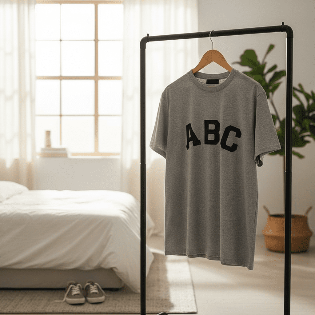 Fear of God (FOG) gray T-shirt, made of premium breathable cotton, features a loose fit with bold black ABC print on chest, unisex streetwear style for casual everyday outfits.