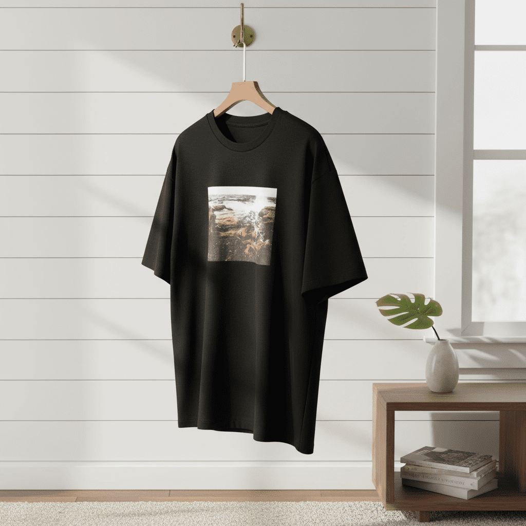 Fear of God (FOG) black graphic T-shirt made of premium cotton, featuring a rock and ocean wave print on the back. Designed by Jerry Lorenzo, stylish, breathable, and perfect for everyday wear.